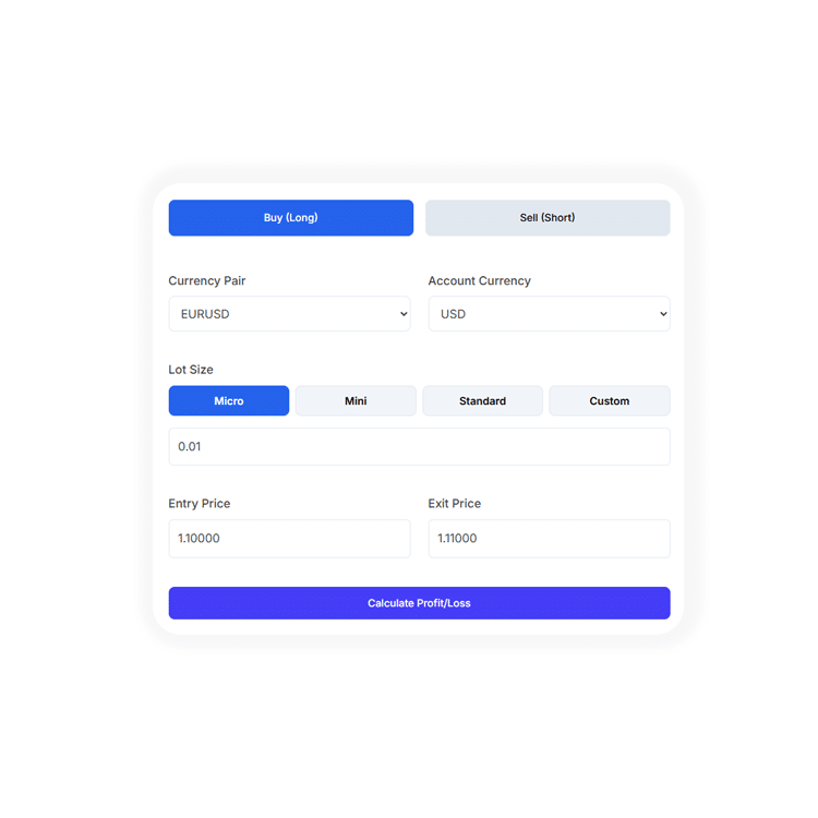 Enter the entry price, exit price, lot size, and currency pair. The tool will display your potential outcome.